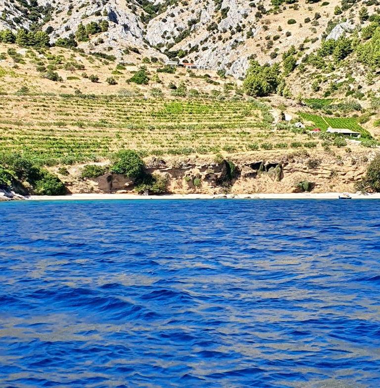 A secluded bay on the island of Brac with exceptionally clear Adriatic waters, ideal for a relaxing afternoon swim. Known for its remarkable water transparency and natural rocky coastline, Brac offers the perfect setting for swimming, snorkeling, or simply unwinding on your private speedboat surrounded by peaceful Mediterranean scenery.