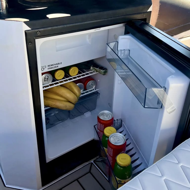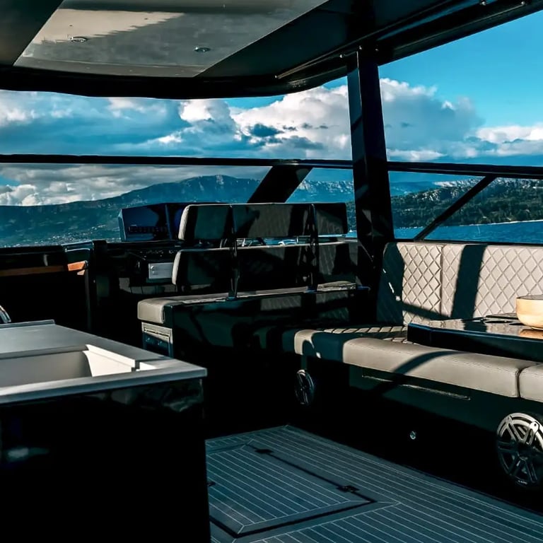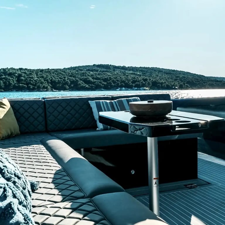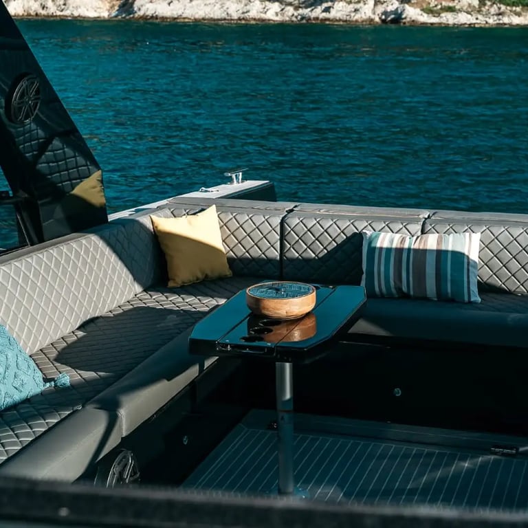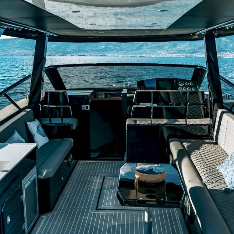 Created specifically for private boat tours in Split, not shared group excursions, the Colnago 35 offers the most spacious and luxurious onboard experience in our fleet, perfect for families, couples, friends, stag and hen parties, honeymooners and senior guests who want the comfort of a motor yacht. A long rigid T-top provides generous shade across the entire seating area, with a large dining table underneath ideal for relaxed lunches at anchor. The stern sundeck offers ample space for sunbathing, while the private cabin below deck with an integrated toilet and bed adds a level of comfort and discretion rarely found on day boats. For refreshment, there is an onboard shower with a 150L water tank and an 80L electric fridge with freezer compartment, fully stocked and with cold drinks included in the price for every tour. Seven integrated cup holders keep drinks within reach at all times. Premium ambient interior and underwater lights, a powerful JL Bluetooth audio system with 4 speakers and subwoofer, a wide stern swimming platform with ladder, and an optional towable tube ensure every moment on board is enjoyable. Snorkeling goggles are provided for all guests, allowing you to fully explore the crystal-clear Adriatic Sea at every swim stop. If you are searching for a motor yacht experience in Split, the Colnago 35 offers the perfect balance of Croatian craftsmanship, comfort, and elegance for unforgettable luxury boat tours and VIP transfers along the Dalmatian coast.