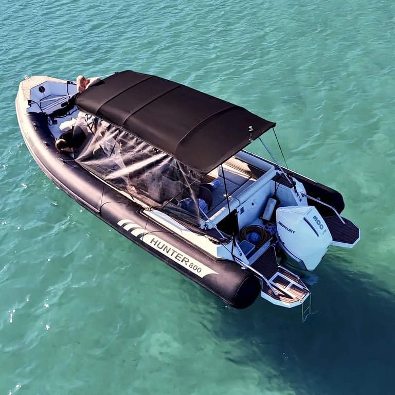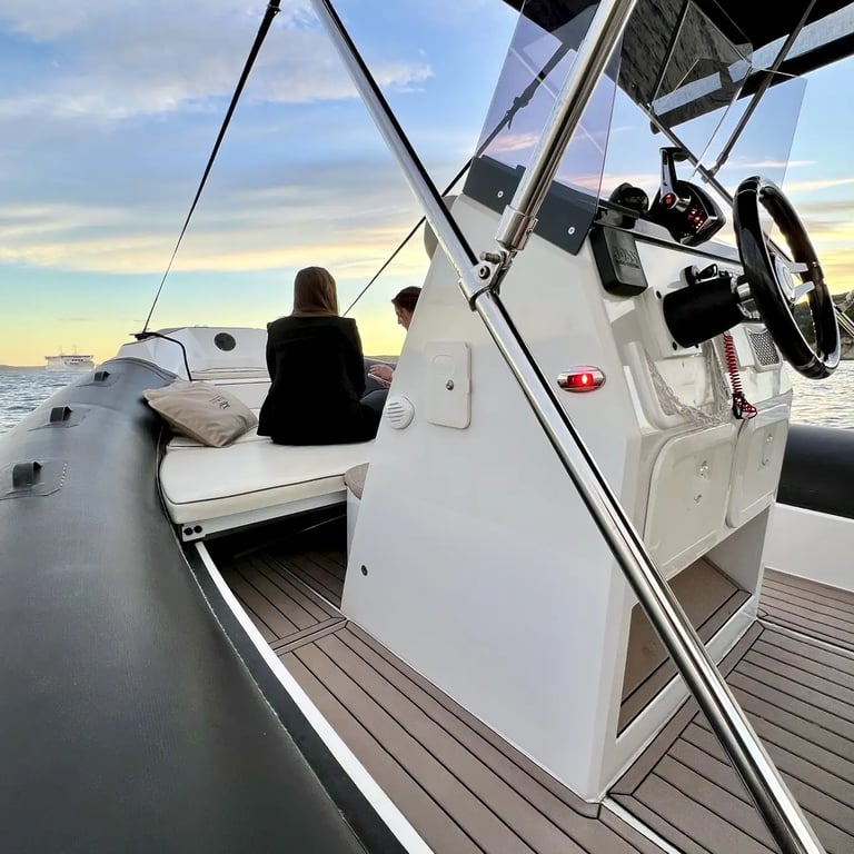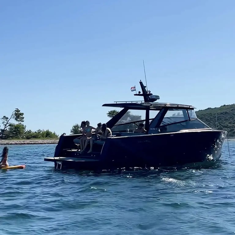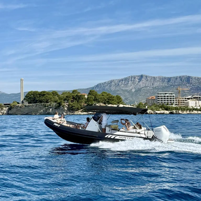 Built in 2023 and powered by a powerful 2024 Mercury Verado 300 HP outboard engine, this premium 9 meter black RIB speedboat combines Croatian craftsmanship with a design inspired by American Navy ribs. With a beam of 3.2 meters, a deep V-hull, and oversized 60 cm Orca carbon tubes, the boat delivers great stability, safety, and performance even in rough Adriatic conditions. A 400 liters fuel tank ensures outstanding range, cruising comfortably at 22 knots while reaching max speed of up to 50 knots. Designed to accommodate up to 11 guests plus skipper, the open layout maximizes space without compromising safety or comfort. Equipped with a 7” Simrad touchscreen plotter and full safety gear for all passengers, this professional “Pro version” RIB is ideal for full-day and half-day boat tours, sunset cruises, and day or night transfers. Located in Marina Zenta, Split, Croatia, it is optimized for exploring the Dalmatian islands such as island of Hvar, Brac, Drvenik Veliki, Drvenik Mali, Vis or Solta in complete confidence and style. Comfortable speedboat cruising, sunbathing or shaded relaxation, and premium onboard audio make the journey as enjoyable as the stops.