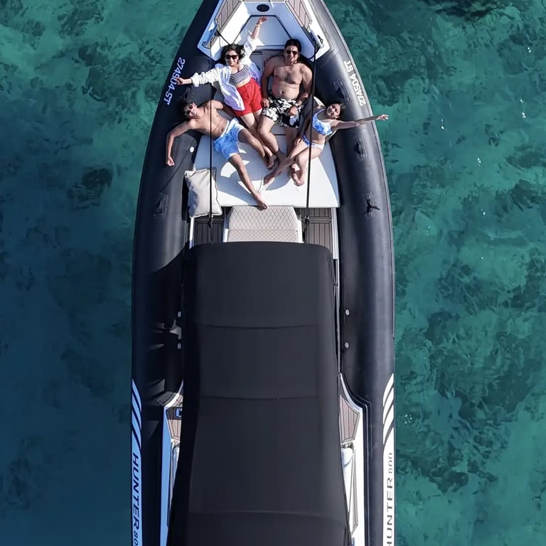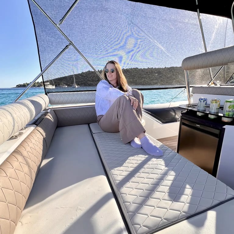 Created specifically for private boat tours in Split, not shared group excursions, the open layout connects guests in a relaxed social atmosphere perfect for families, couples, friends, stag and hen party, honeymooners and senior guests. The boat features two spacious sundecks at bow and stern, with the stern sundeck convertible into a dining table and comfortable U-shaped seating area. A large Bimini top with additional side curtains provides deep shade even during peak summer heat. For refreshment, there are two onboard showers with an 80L water tank and a 50L electric fridge with freezer compartment, fully stocked and with cold drinks included in price for every tour. A dedicated console with ten integrated cup holders ensures drinks are always secure and within reach. Premium waterproof leather cushions, ambient interior and underwater lights, a powerful BOSS Audio Bluetooth system with subwoofer, two swim platforms with ladder, multiple storage compartments, and optional towable tube add both luxury and fun to every trip. Snorkeling goggles are provided for all guests, allowing you to fully enjoy the crystal-clear Adriatic Sea at every swim stop. If you are searching to rent a boat in Split for an exclusive experience, this RIB offers the perfect balance of performance, comfort, and elegance for unforgettable luxury boat tours in Croatia and VIP boat transfers from Split, Croatia.