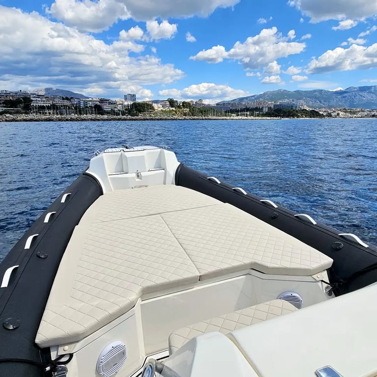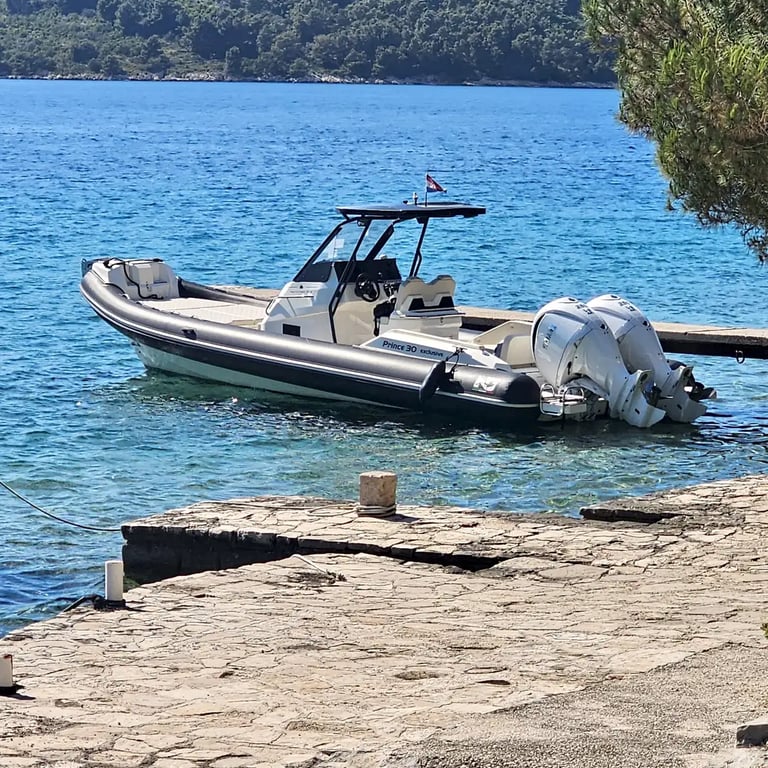 Built in 2025 and powered by twin Yamaha 250 HP outboard engines delivering a combined 500 HP, the Nuova Jolly Prince 30 Exclusive is one of the most powerful and refined RIBs available for private tours from Split. Manufactured in Italy by Nuova Jolly — one of the most respected names in premium RIB construction — this 9.6 meter speedboat combines Italian craftsmanship with performance engineered for the open Adriatic. With a beam of 3.2 meters, a deep V-hull, and a 410 liter fuel tank, the boat delivers exceptional range and outstanding stability in all sea conditions. Cruising comfortably at 22 knots while reaching a top speed of 58 knots, it is the fastest boat in our fleet. Designed to accommodate up to 11 guests plus skipper, the open layout maximizes space without compromising safety or comfort. Equipped with a 12" Simrad touchscreen plotter and full safety gear for all passengers, this exclusive RIB is ideal for full-day and half-day boat tours, sunset cruises, and day or night transfers along the Dalmatian coast.