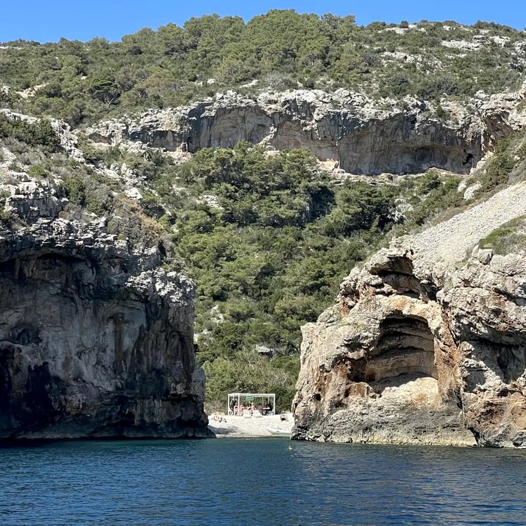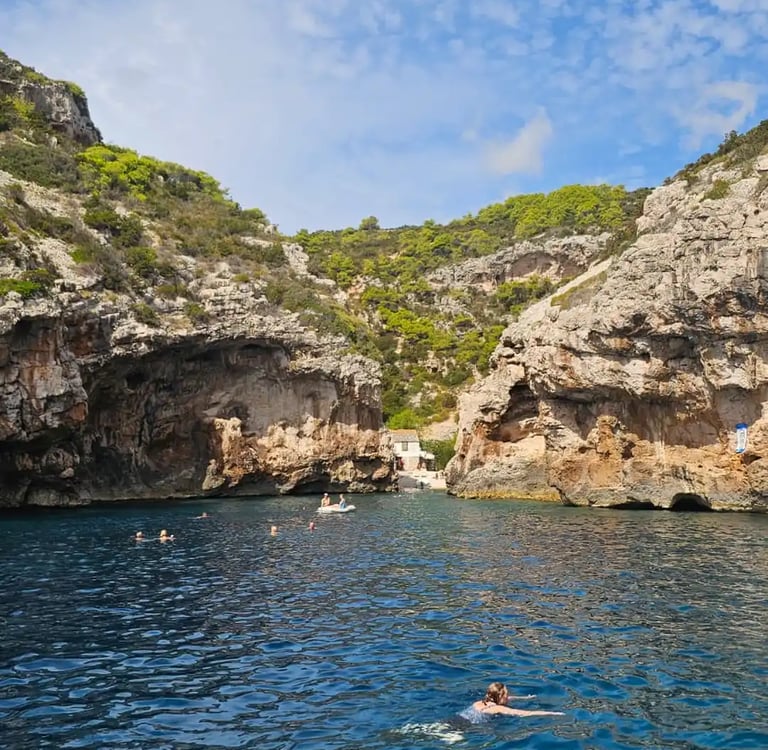 Stiniva is a beautiful natural bay on the island of Vis, known for its tall surrounding cliffs and narrow sea entrance that opens into a small pebble beach. It’s one of the most recognizable spots on Vis and a highlight of any Blue Cave and Vis island tour from Split. Here, you can swim in clear turquoise water, snorkel along the rocky sides of the bay, or simply relax on the boat and take in the scenery. Visiting by private speedboat allows you to enjoy the area comfortably and at your own pace.